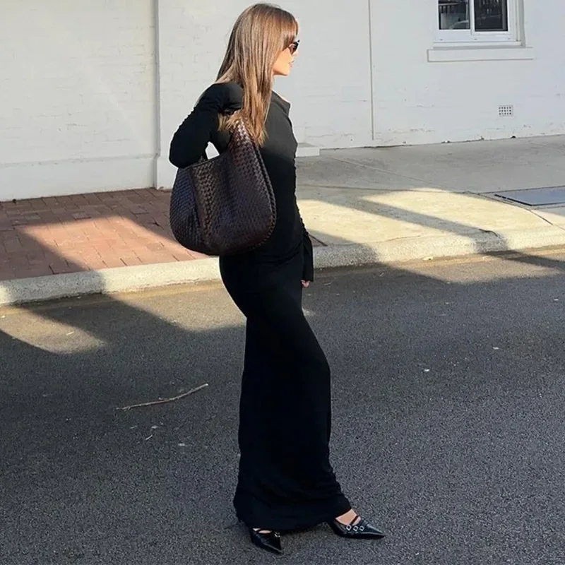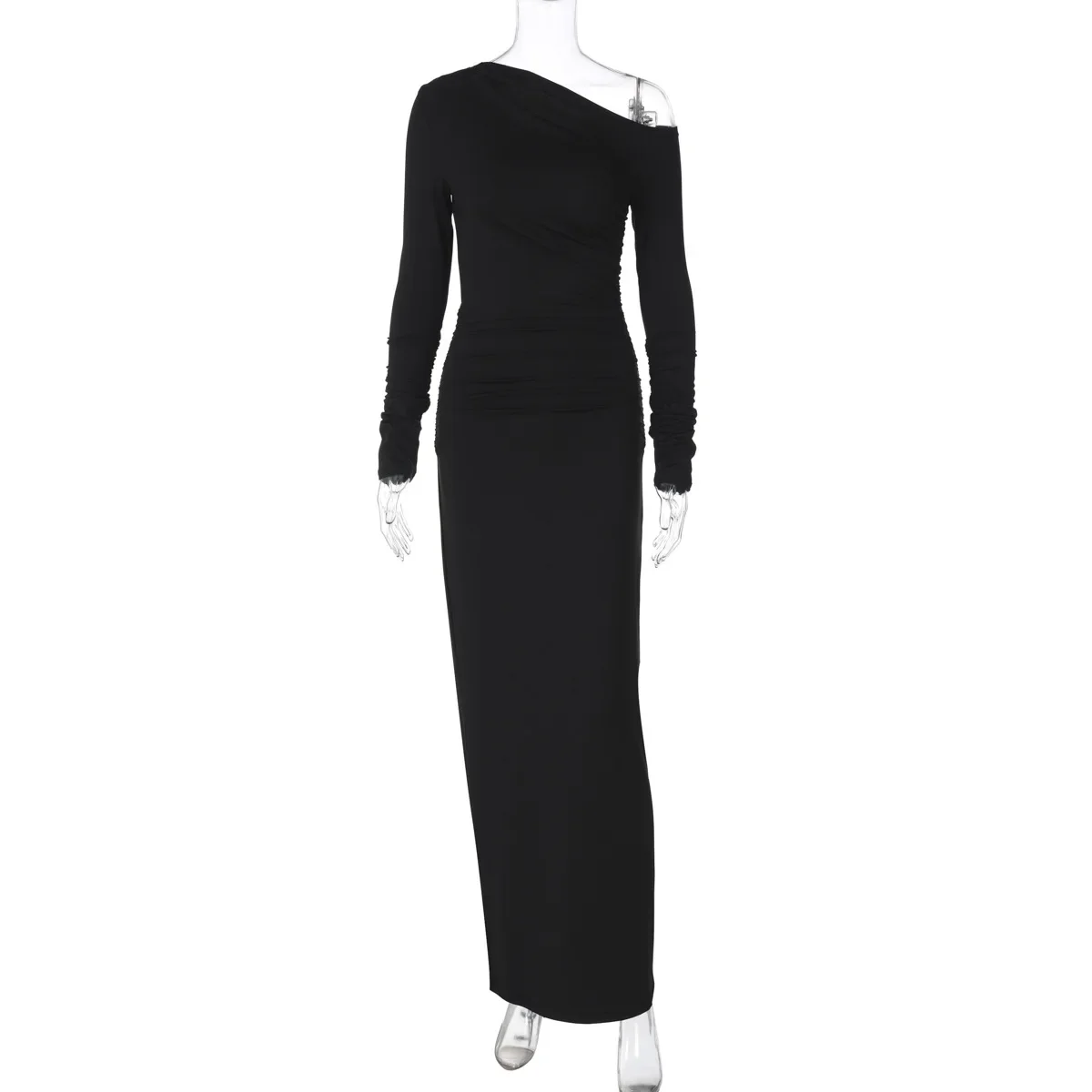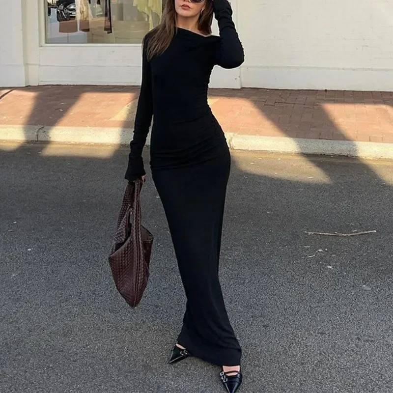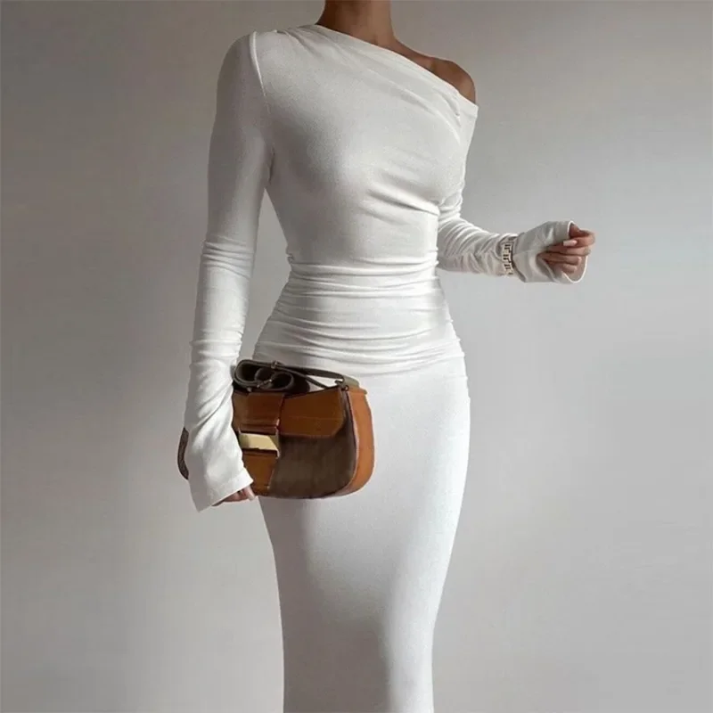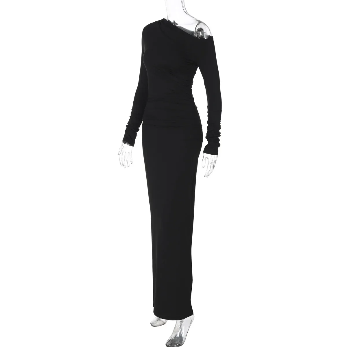 Autumn Slim Long Dress Women's Solid Off-Shoulder Long Sleeve High Street Dress Elegant Party Dress Female Outfits Robe