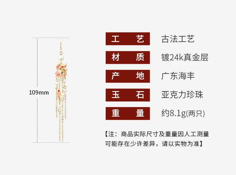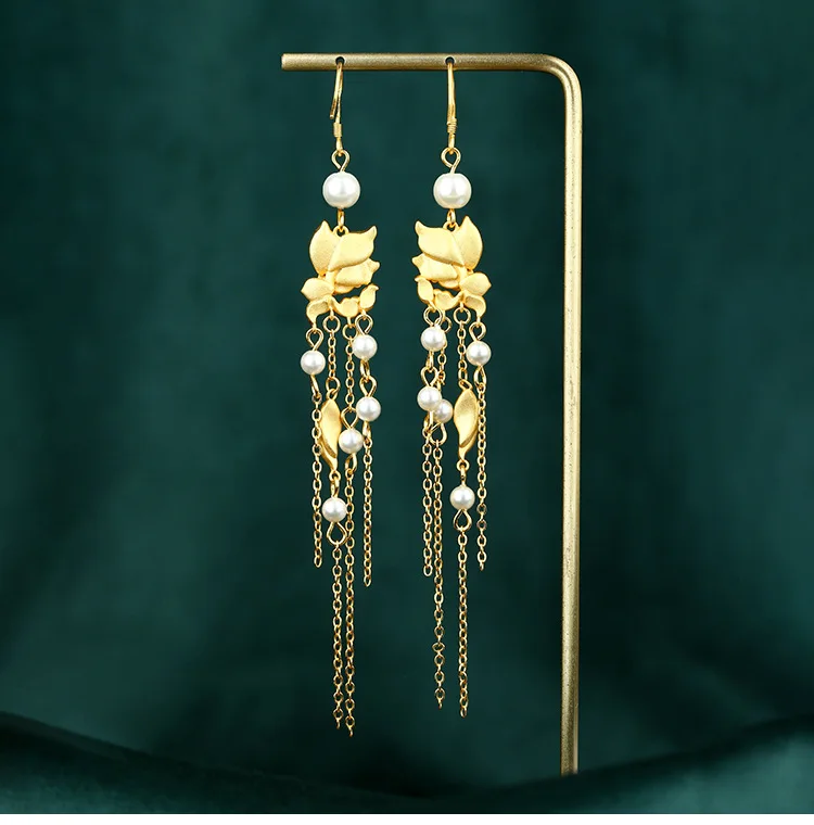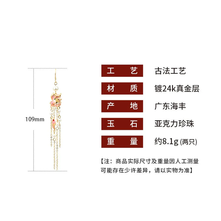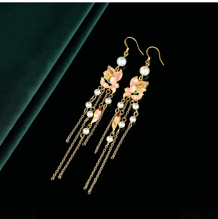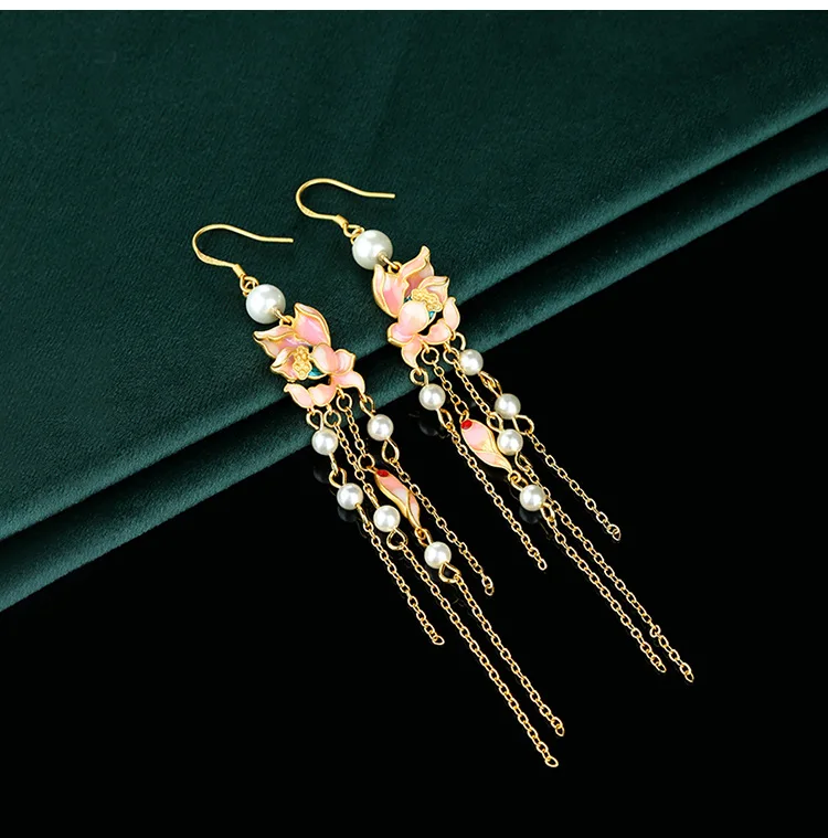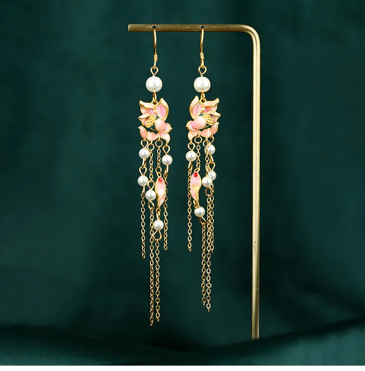 Chinese Style National Fashion Enamel Ancient Gold-Plated Lotus Pearl Long Fringe Earrings Retro Han Chinese Clothing Earrings