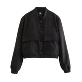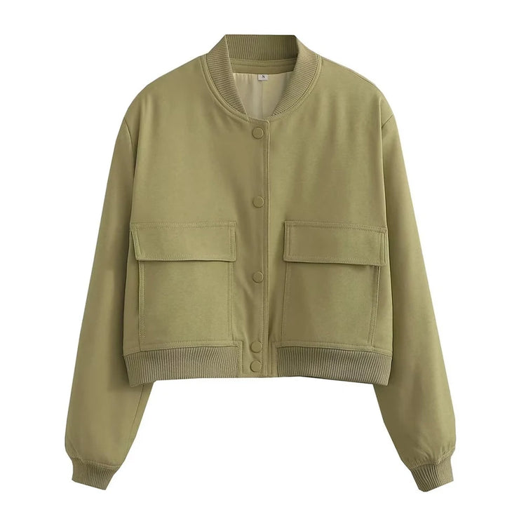 TRZA Women Fashion With Pockets Bomber Jacket Coats Vintage Long Sleeve Front Button Casual Female Outerwear Chic Tops
