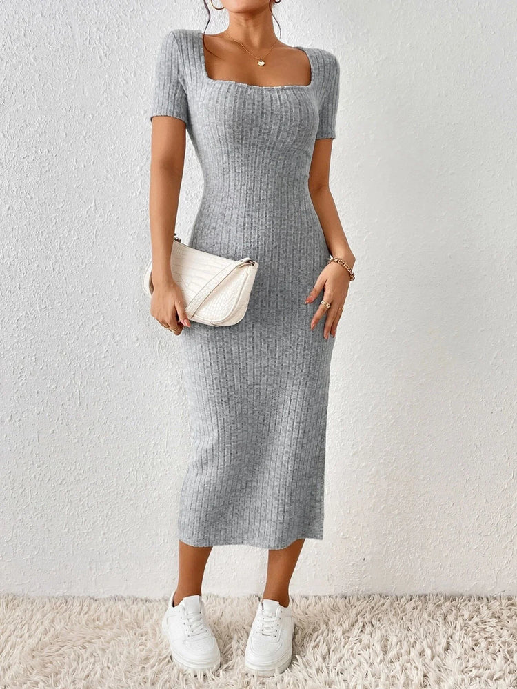 Women Spring Summer Style Knitted Dress Lady Casual Short Sleeve Square Collar Side Slit Dress Vestidos