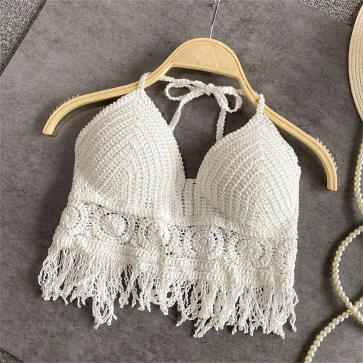 Women's Boho Fringe Backless Halter Tie Neck Underwear Outerwear with Neck Hanging Embroidery Tassel Suspender Vest Short Tank