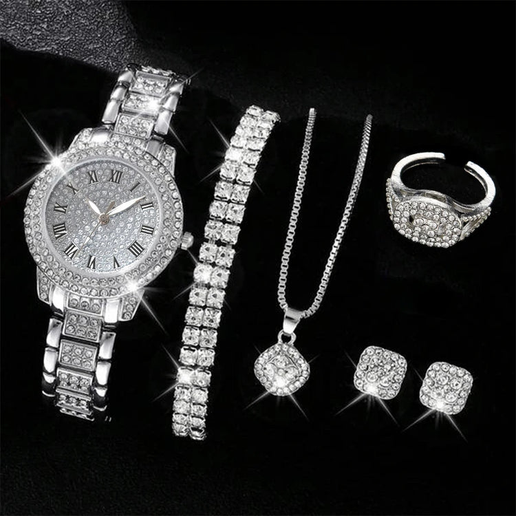 6PCS/SET Silver Women's Watch Business Leisure Element Watch Luxury Dial Quartz Watch Jewelry Set Gift For Her