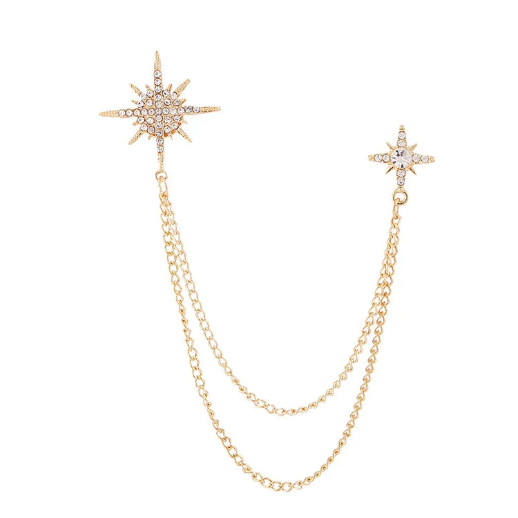 Korean Crystal Crown Brooch Star Tassel Chain Rhinestone Lapel Pins Men's Shirt Suit Collar Wedding Party Badge Accessories