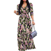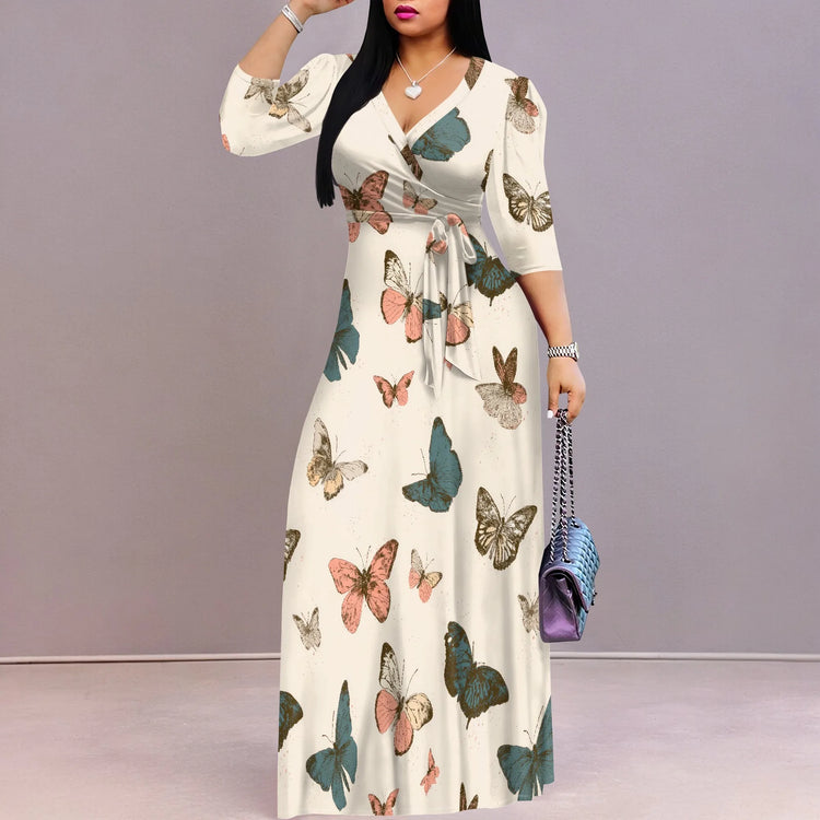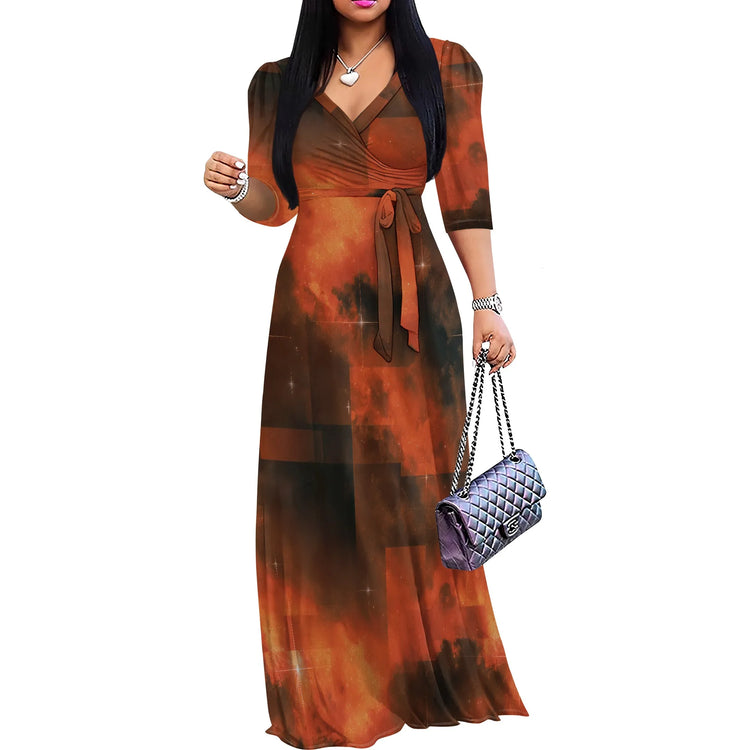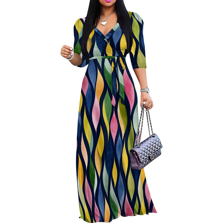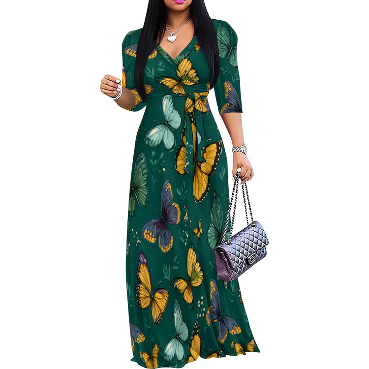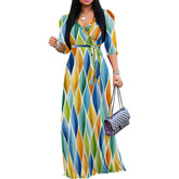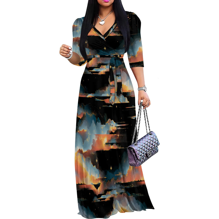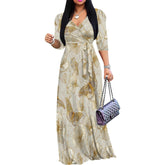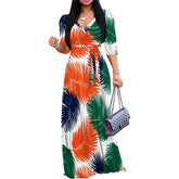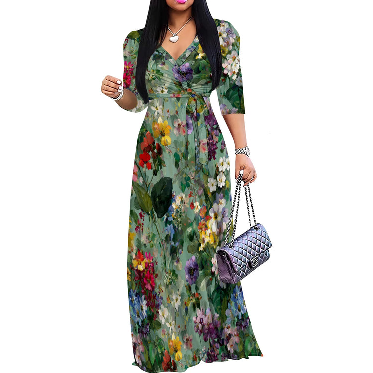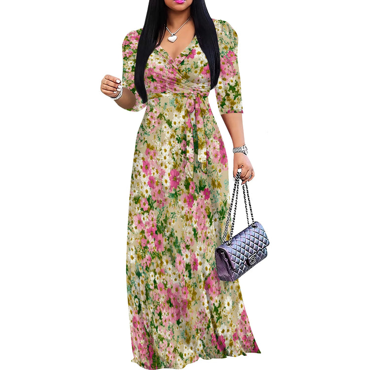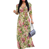 Plus Size Maxi Dresses for Women Casual Flowy Long Dress 3/4 Sleeve V Neck Wrap Dress with Belt