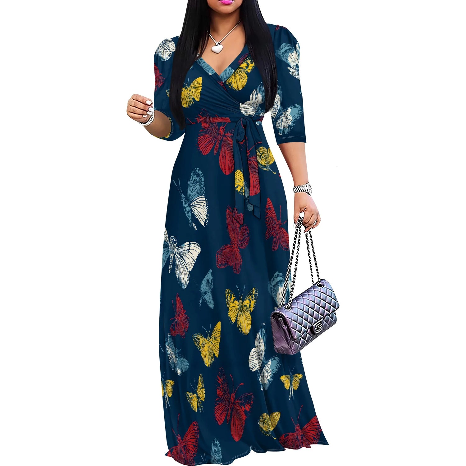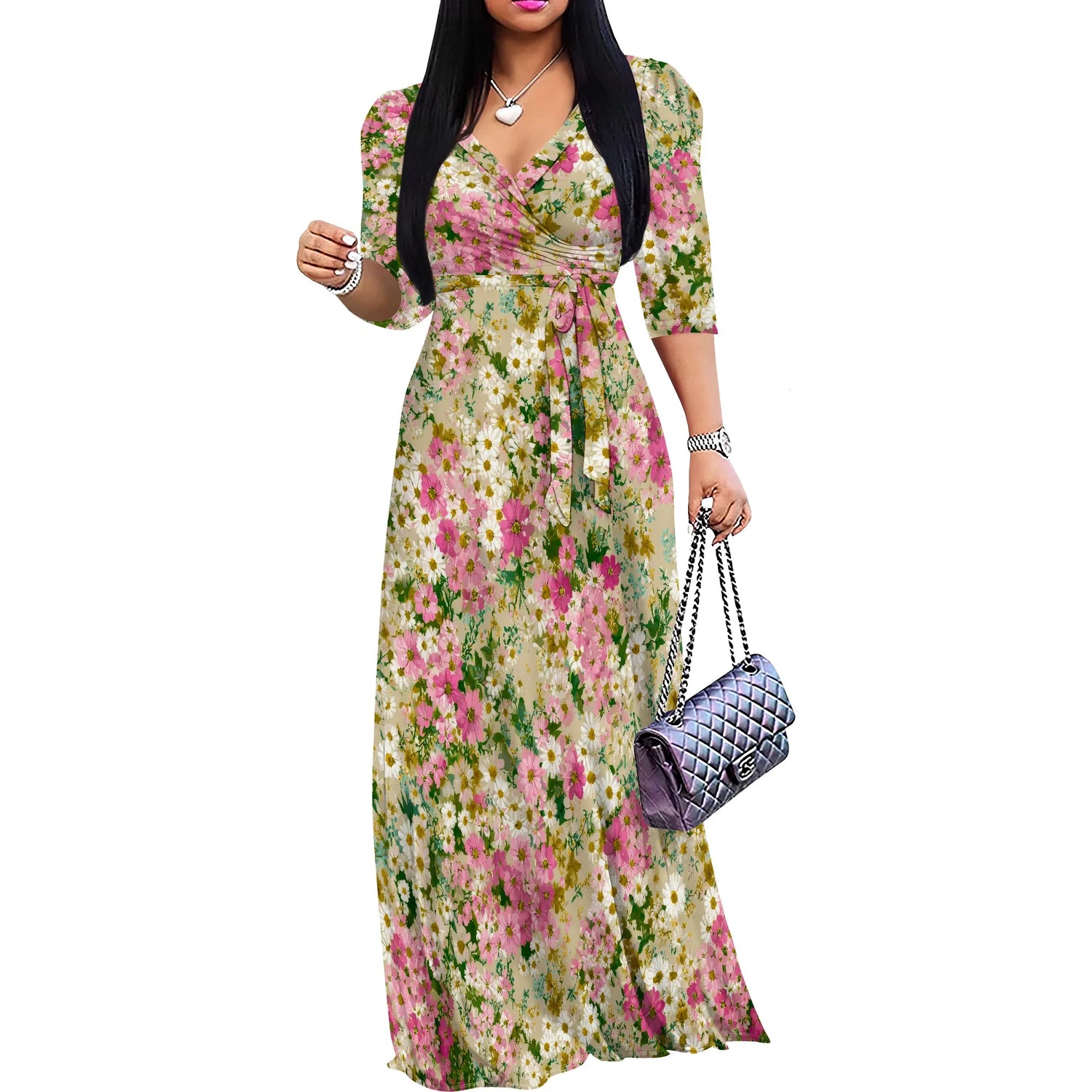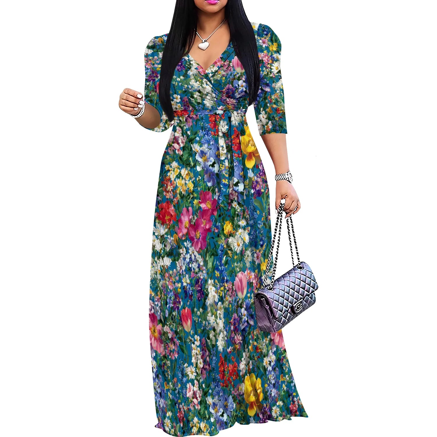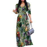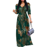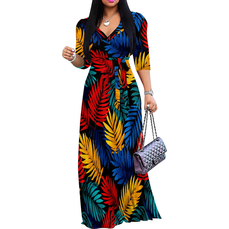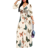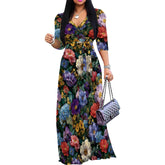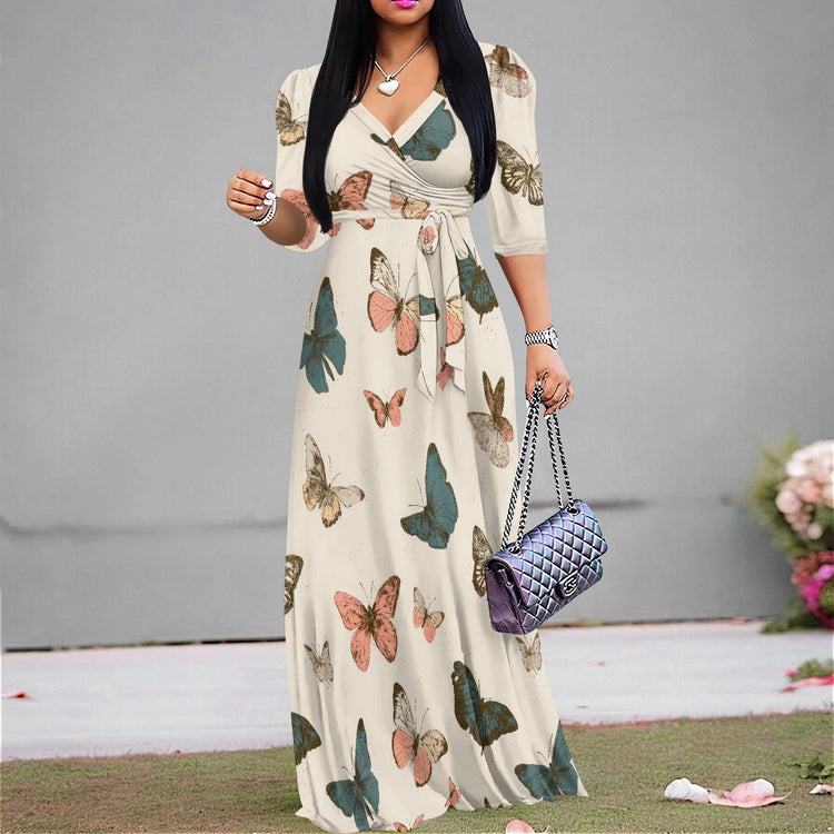 Plus Size Maxi Dresses for Women Casual Flowy Long Dress 3/4 Sleeve V Neck Wrap Dress with Belt