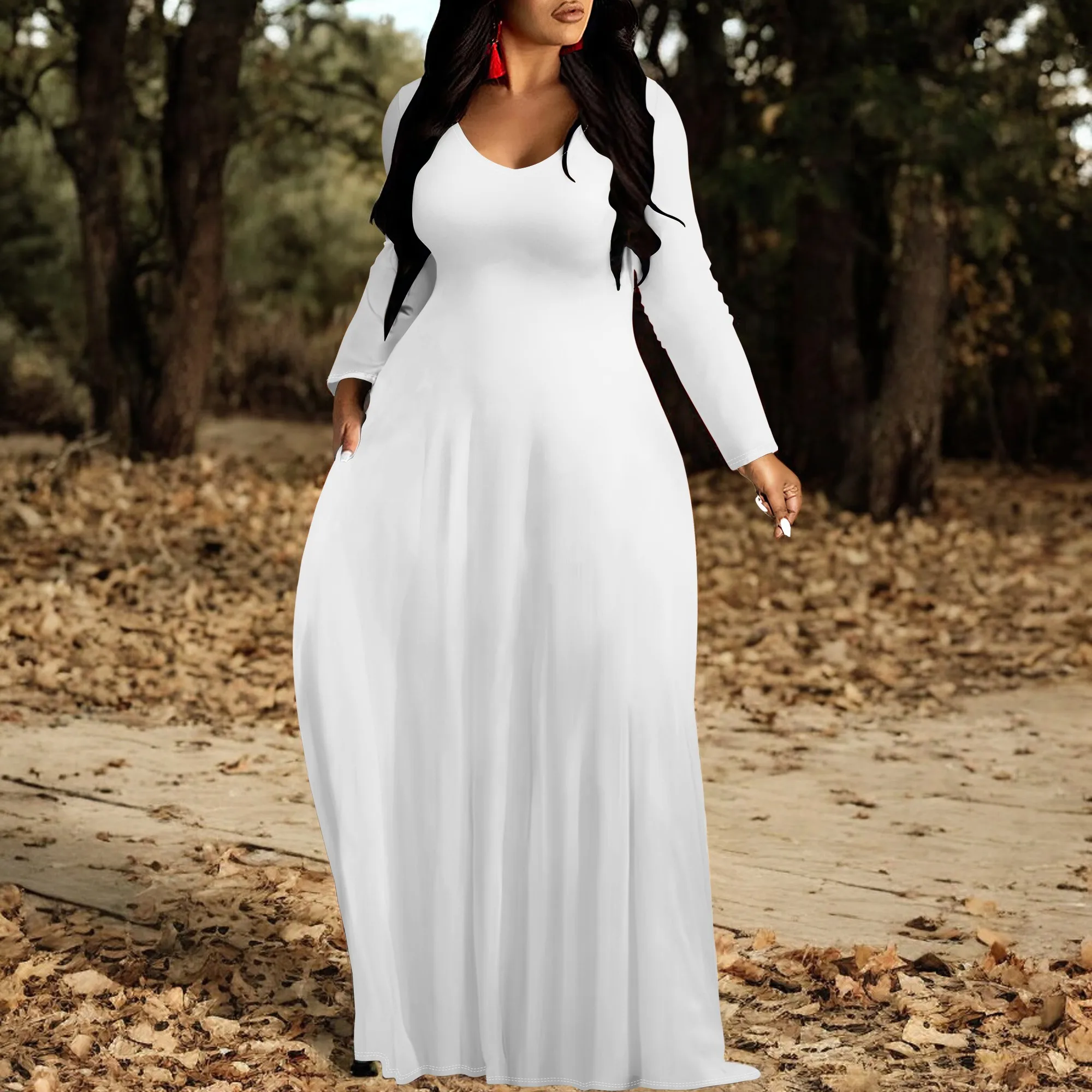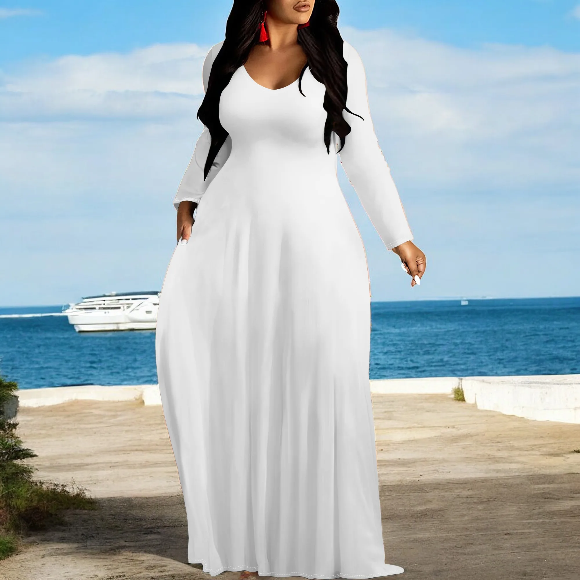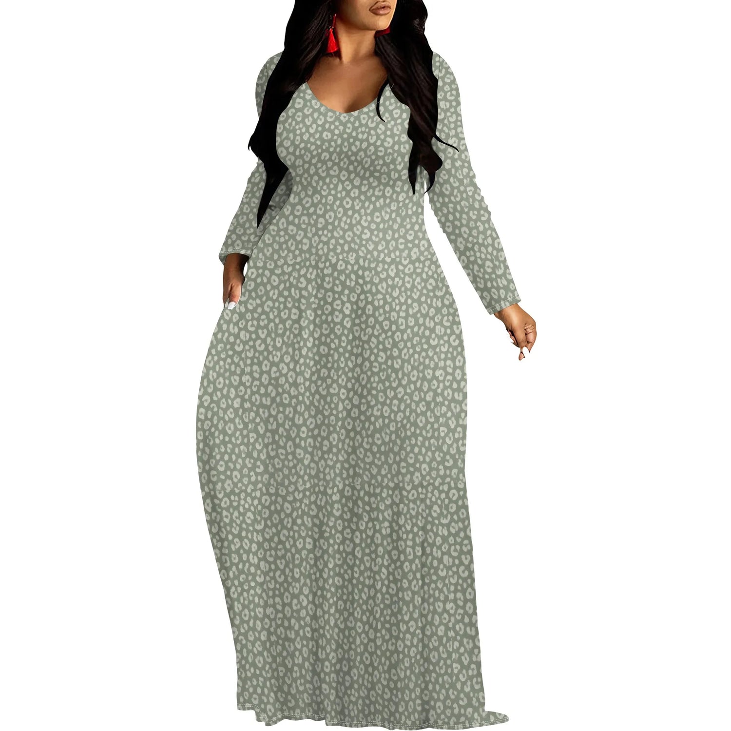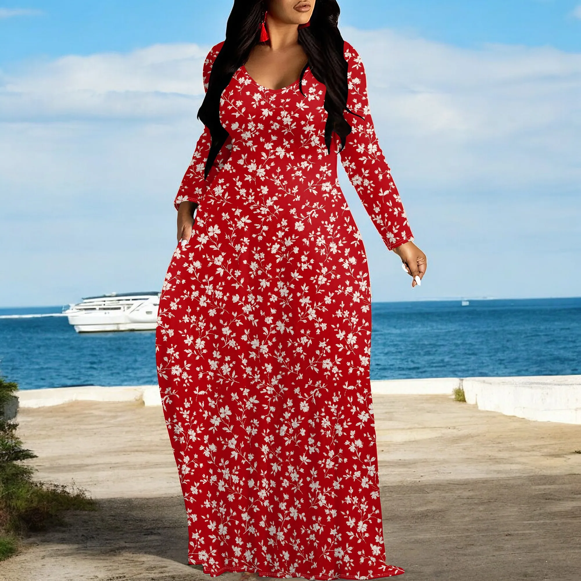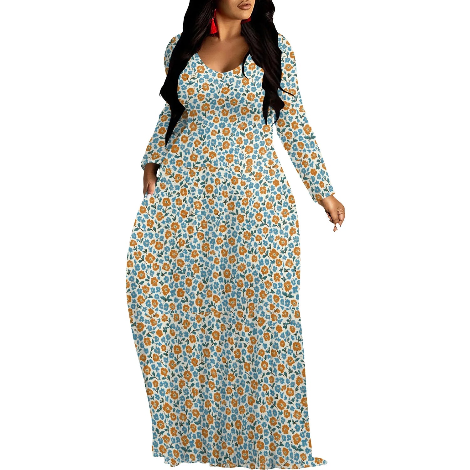 Women's V Neck Maxi Dress Ruffles Full Sleeve Floral Dresses Wedding Guest Sundress with Belt